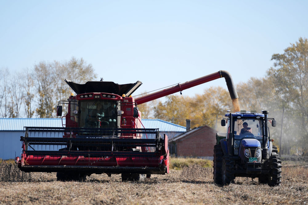 在黑龙江省富锦市一处地块,收割机卸下刚收获的大豆。新华社记者王建威 摄